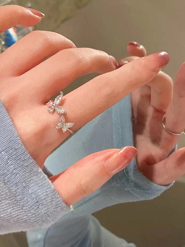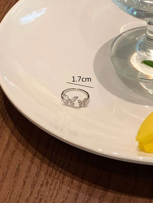 Anel prata de strass e decoração borboleta